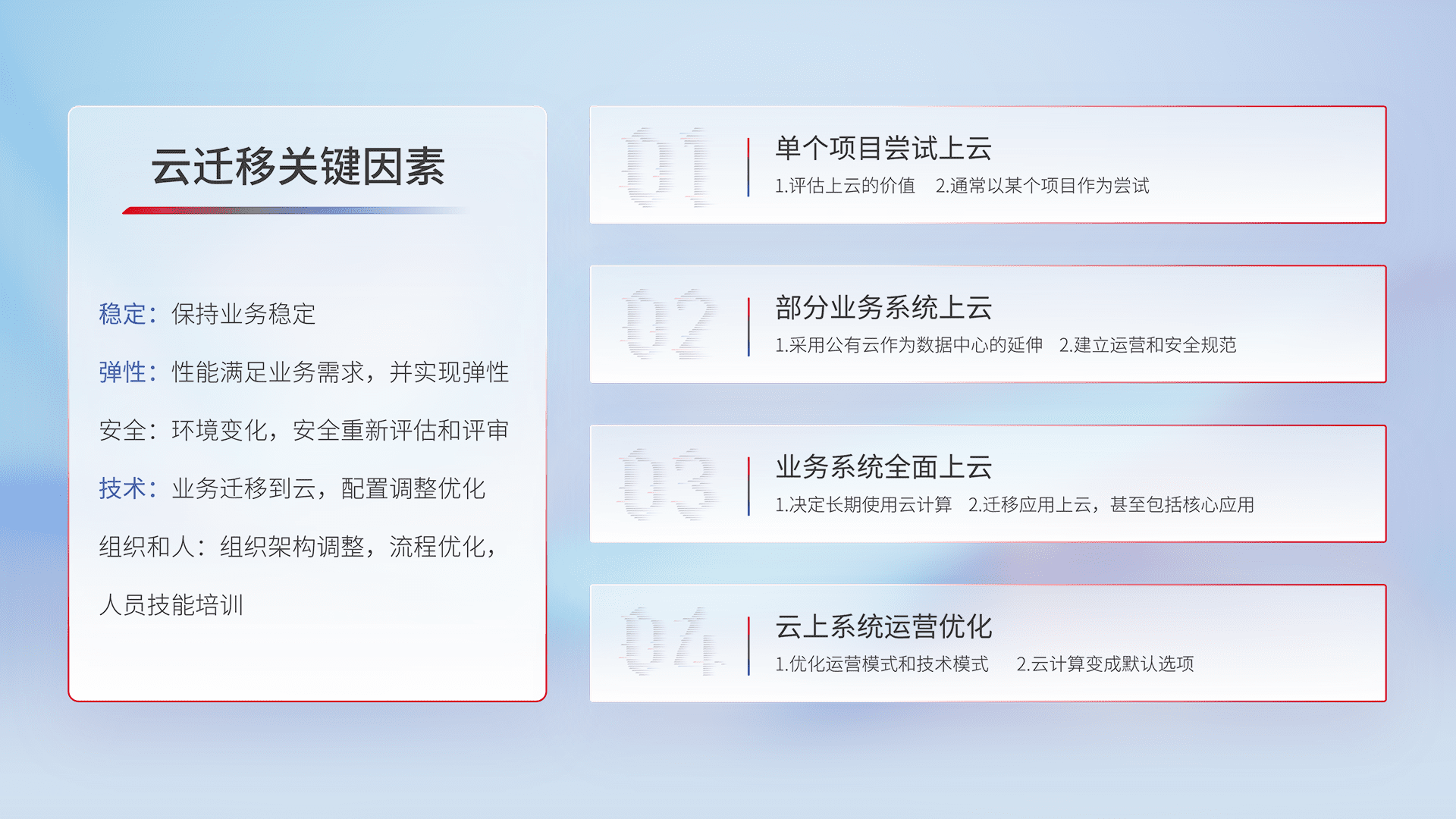 结合实际业务,,,从规划设计、、、、云平台选型、、、、云原生改造、、、、数据迁移、、、、集成交付,,迁移全过程为客户识别最佳上云路径,,做好风险识别管理,,设计网络架构、、、身份权限、、安全审计合规、、、、操作审计、、、日志审计、、、、监控告警策略、、、多站点容灾设计等,,对云上基础设施进行整体规划,,,,提升IT治理水平,,以满足弹性、、、高可用、、高性能的需求。。。