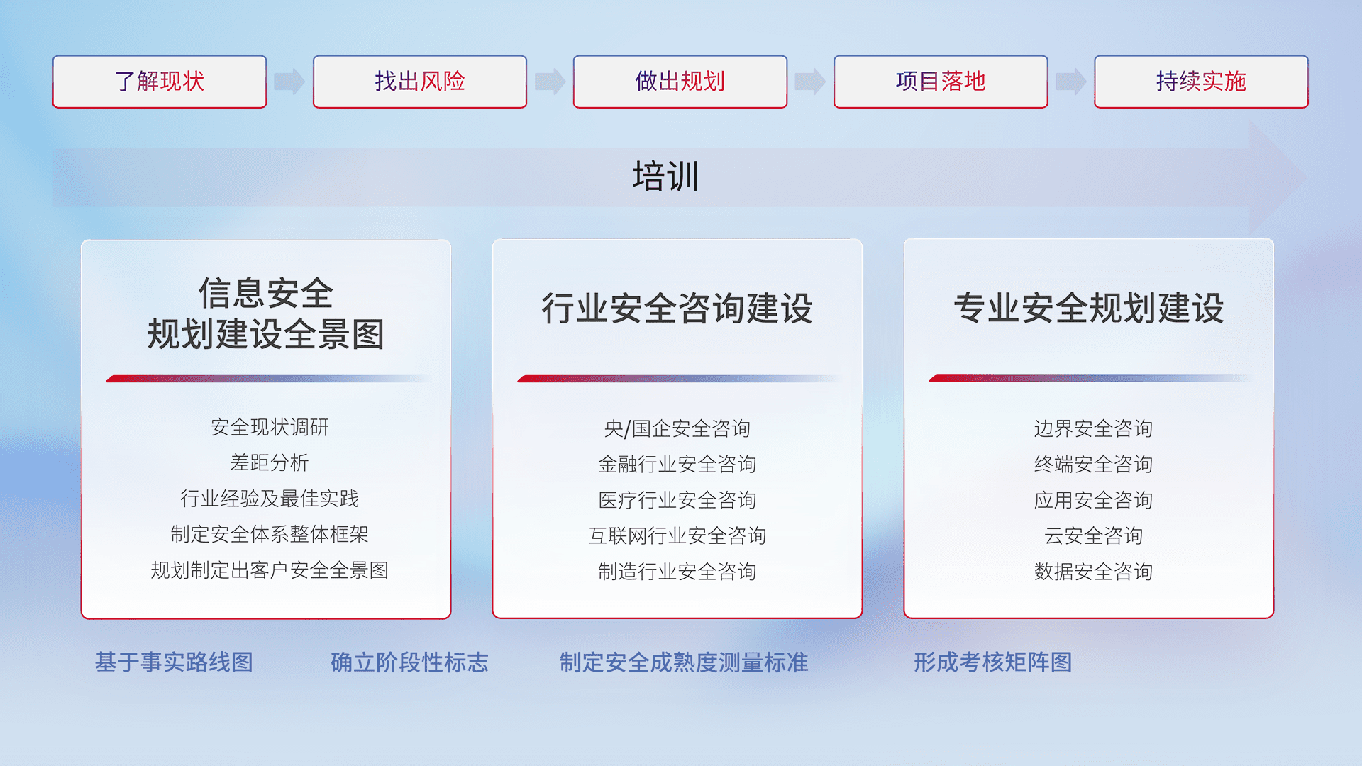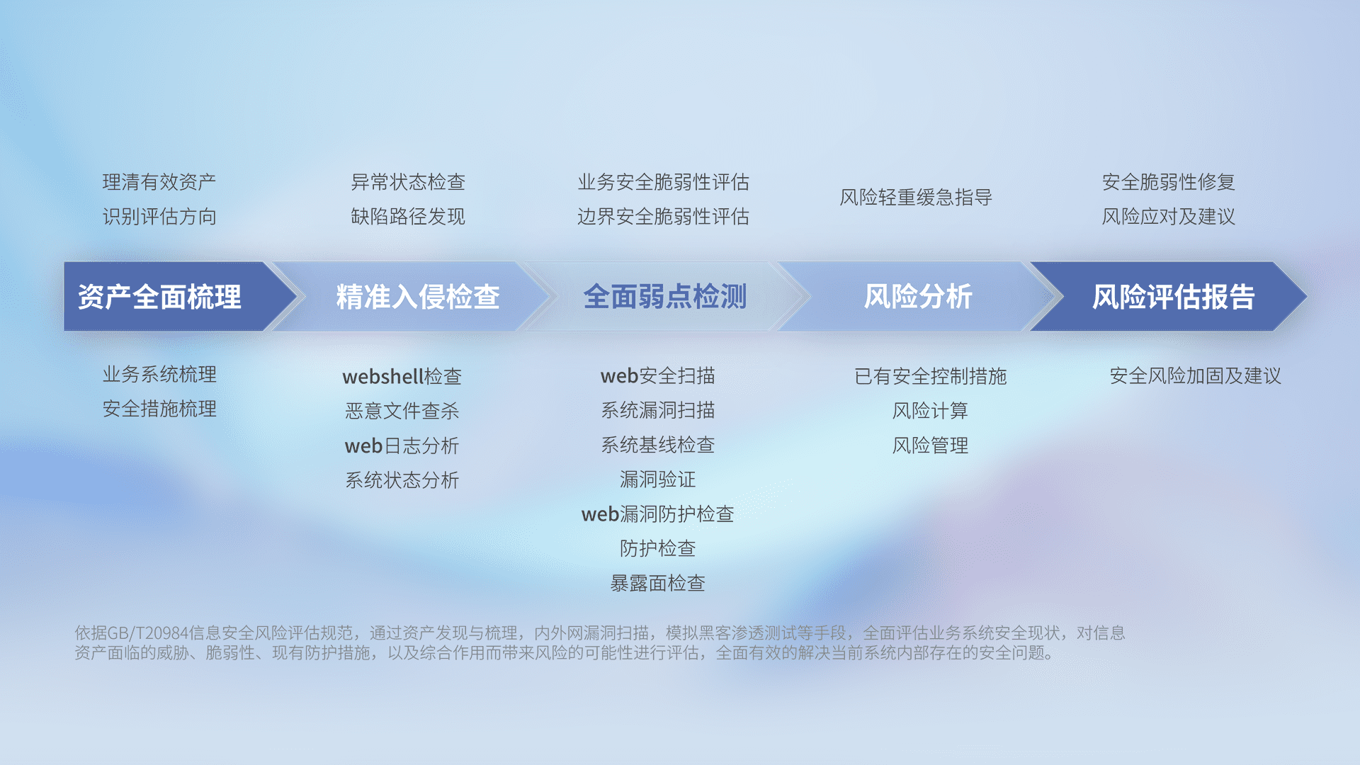 针对客户行业特性,,,,以专业的安全服务+多厂商联合解决方案提供专属的一站式安全管理服务,,帮助客户全面感知网络空间威胁,,,基于识别、、、、检测、、、、分析、、、、防护、、、、监测、、、、响应的服务理论模型,,,从方案咨询、、集成交付、、、评估验证、、优化加固、、、、运维运营,,,致力于为客户提供完整的闭环管理式安全服务。。。。以实战经验为客户打造高抵御风险的安全体系,,帮助客户发现威胁、、、、对抗威胁、、、、处置威胁,,,不断积累安全对抗能力,,,,持续保障数字化安全。。