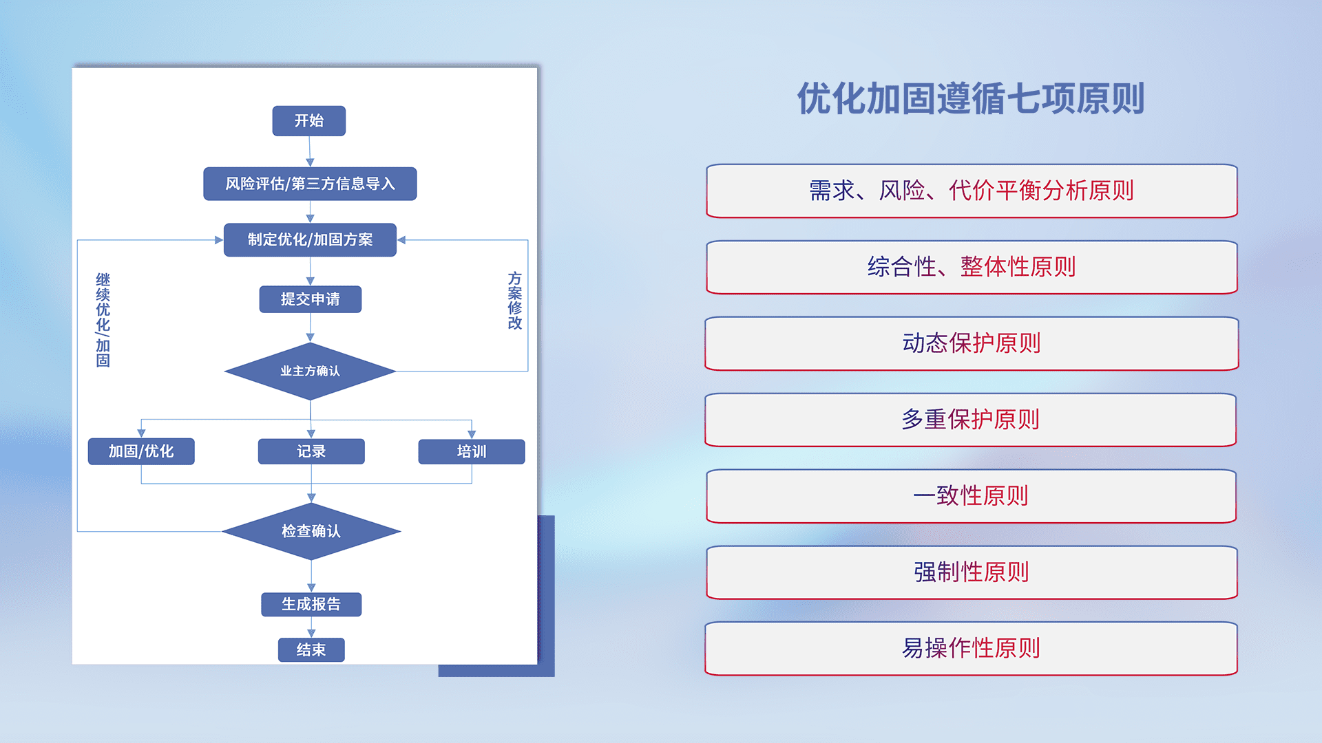 最大程度利用现有资产,,,对评估发现的问题进行封堵与整改,,,,防止漏洞被利用,,,提升整体网络安全性,,,,为客户带来高标准的优化加固服务。。